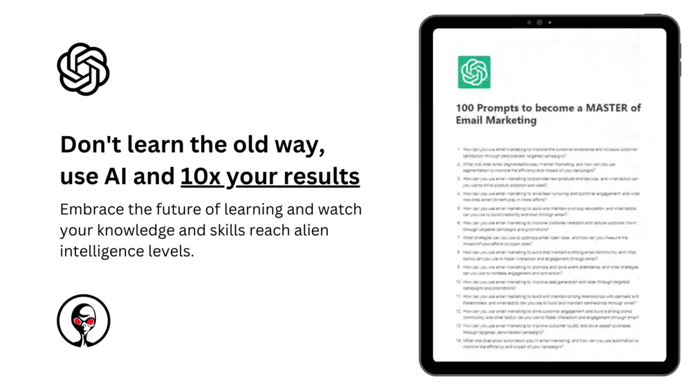 426 Prompts and 25 Techniques to become an ALIEN in Email Marketing" is the ultimate package for marketers looking to push the boundaries. With 426 prompts and 25 advanced techniques, you'll create emails that stand out from the rest.