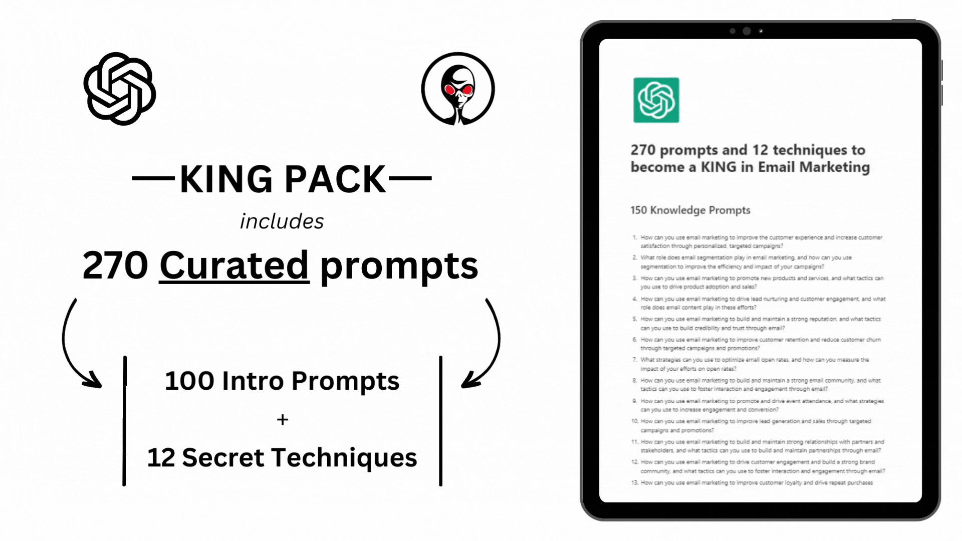 - 270 Prompts and 12 Techniques to become a KING in Email Marketing" is for marketers ready to take their skills to the next level. You'll have access to 270 prompts and 12 techniques designed to help you create emails that convert.